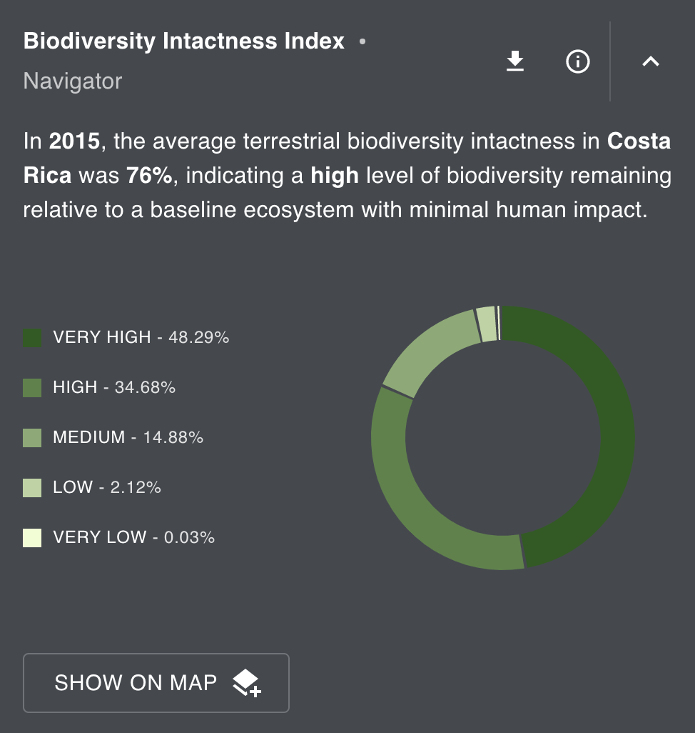Biodiversity Intactness Index (UNEP-WCMC) Indicator calculates the average amounts of high, medium and low biodiversity remaining within a given place in 2015 at a 300 meter resolution.