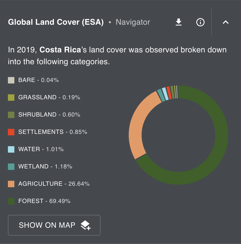 Global Land Cover (ESA) Indicator measures the percent of each land use taxonomy within a given place in 2019 according to ESA’s global Land Use Land Cover (LULC) map at a 300 meter resolution.