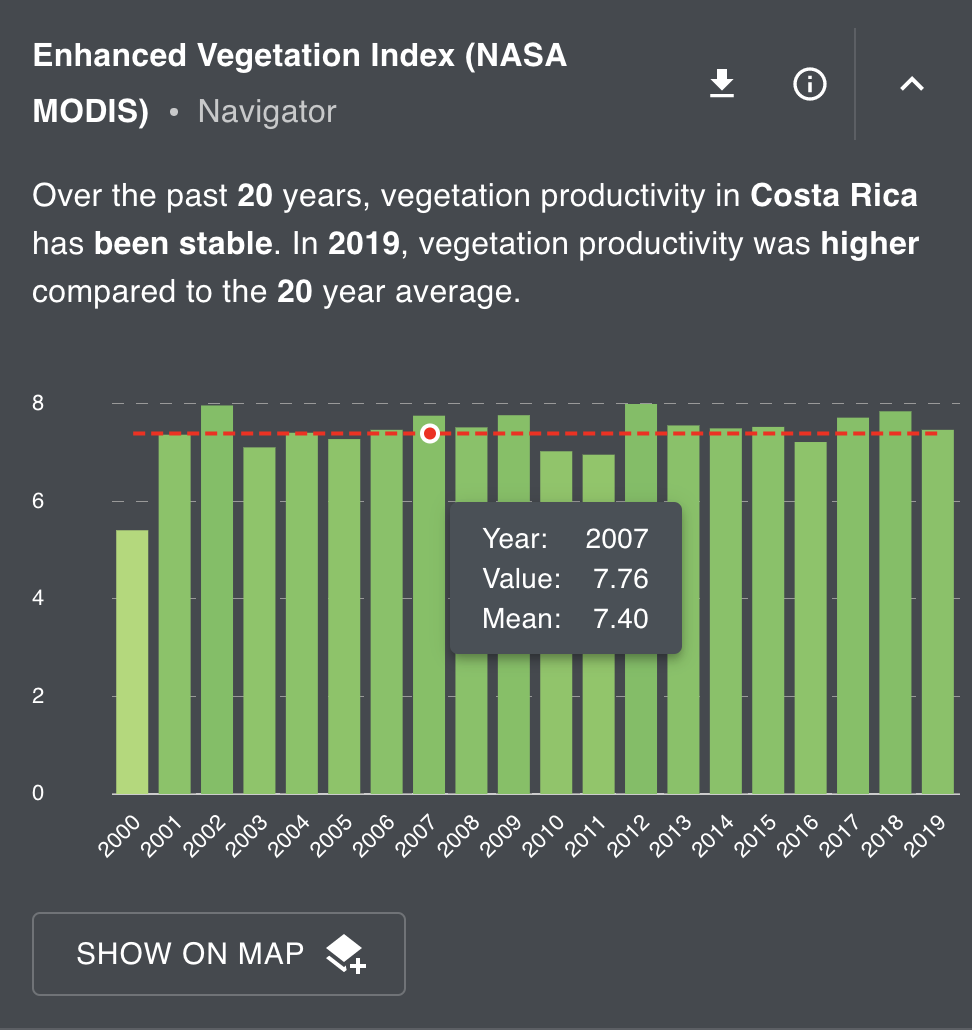 Enhanced Vegetation Index (NASA MODIS) Indicator calculated the sum of the total vegetation productivity within a given place for each year from 2000 to 2019 at a 500 meter resolution.