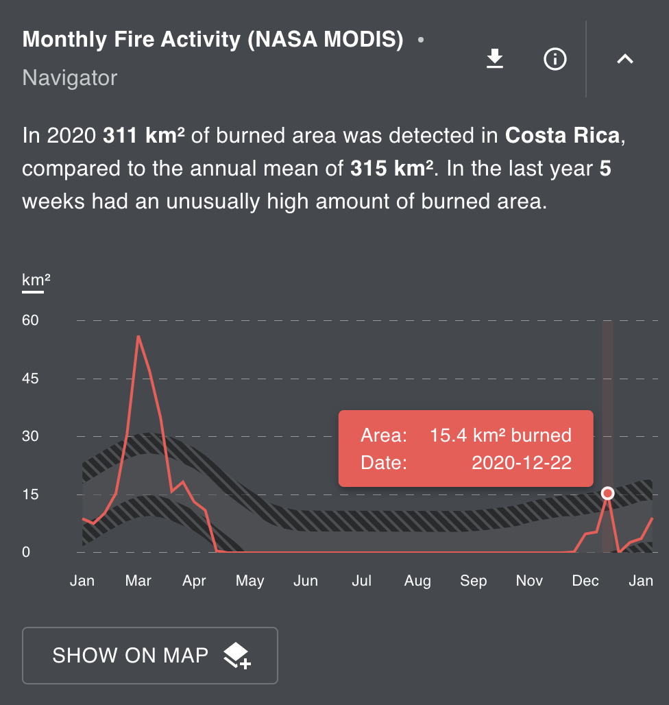 Monthly Fire Activity (NASA MODIS) Indicator calculates and compares the total spatial extent of weekly fires in square kilometers within a given place throughout the year 2020 at a 500 meter resolution.