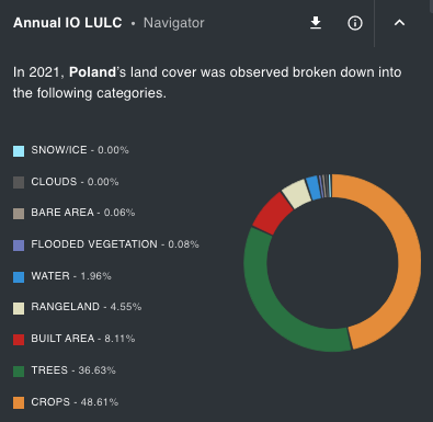 Annual Impact Observatory LULC Indicator measures land use land cover in square kilometers within a given place at a 10 meter resolution for the year 2021.