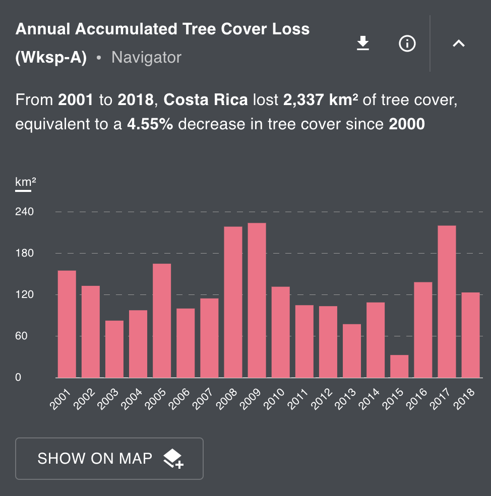 Tree Cover Loss (GFW Annual Tree Loss) Indicator measures tree cover loss in square kilometers within a given place at a 30 meter resolution for each year from 2001 to 2019.
