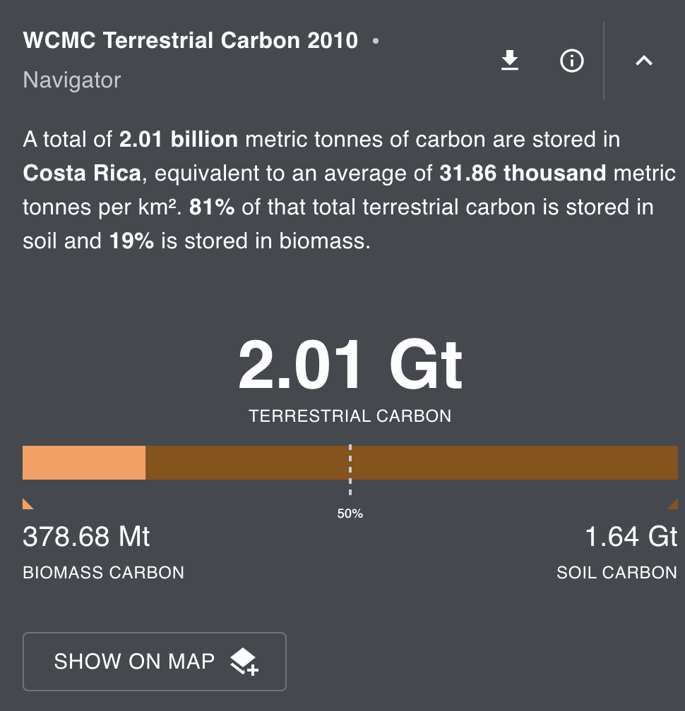 Terrestrial Carbon Density (UNEP-WCMC, 2019) Indicator calculates the total amount of carbon in millions of metric tonnes stored aboveground (biomass) and belowground (soil) within a given place for the year 2020 at a 300 meter resolution.