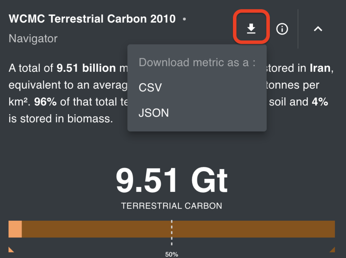 Indicator results are available for download via the Download Button next to each visualization for further analysis. Results can be downloaded as a CSV or JSON file for analysis in a wide range of applications. We suggest using Microsoft Excel or Google Sheets to generate tables and custom graphs for your specific use cases such as reports and presentations.